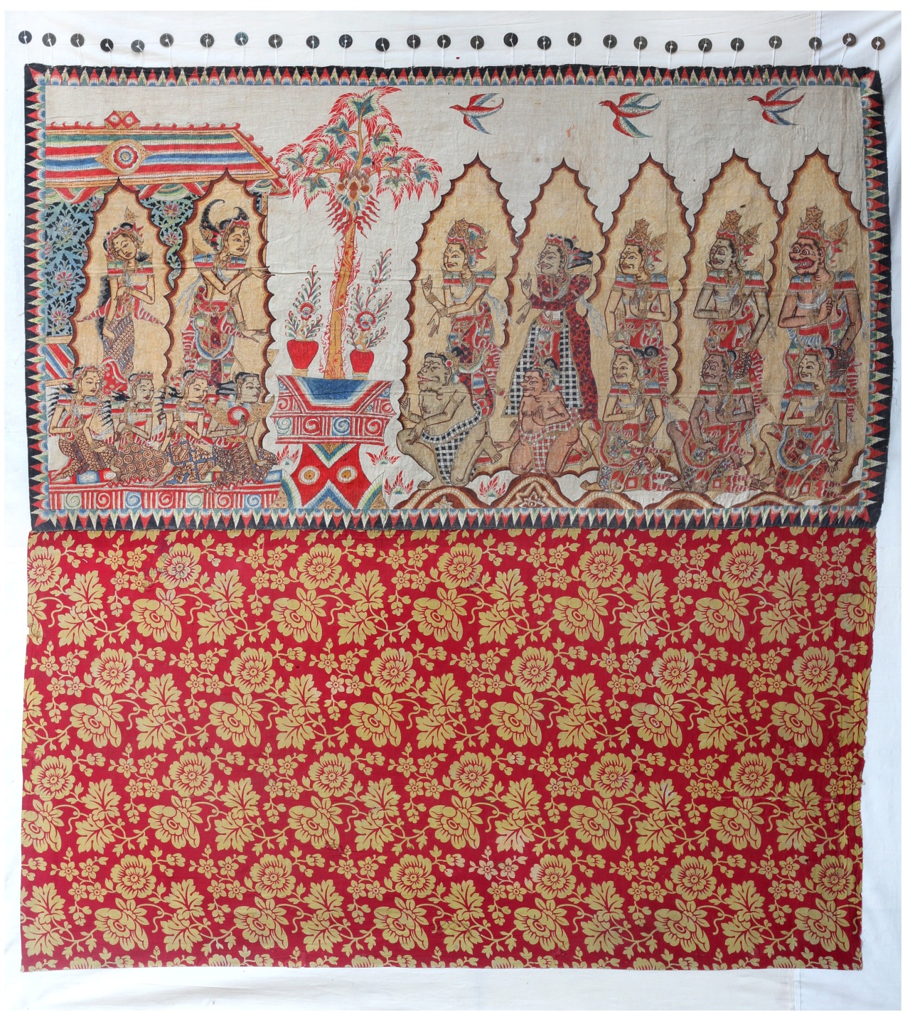 9. Semara and a Deputation of Deities, Anonymous, Kamasan, natural pigments on cotton cloth, Chinese coins attached at top with print cloth below, pre-World War II, 166 x 170 cm