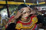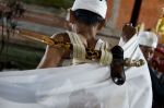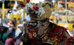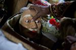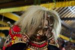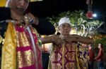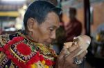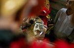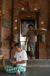 Wayang painter Ketut Madra of Peliatan prepares for a topeng tua performance at the odalan at the Pura Dalem Gde.